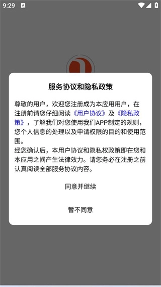 首次打开应用时,需要阅读服务协议和隐私政策,点击同意后才能继续进入应用。