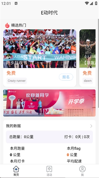 在首页就能看到精选的热门活动以及我的运动数据等功能;