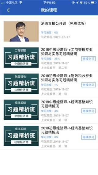 在“我的课程”专区,您能够随时查看已购买的课程清单,并且实时跟进每门课程的学习进展。