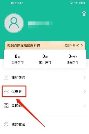 在个人中心界面,选择"优惠券"功能入口。