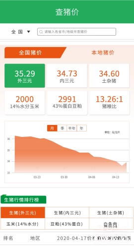 覆盖全国的猪价信息,首页呈现了外三元、内三元以及土杂猪等不同品种的猪价情况。
