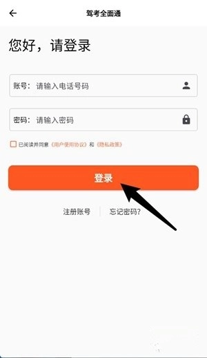 用户打开驾考全面通App,进入登录页面后,填写注册时使用的手机号和匹配密码,仔细阅读用户协议并勾选同意,再点击显眼的橙色登录按钮,即可完成账号验证流程。