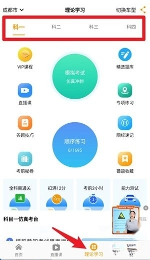 通过底部导航栏切换到“直播课”板块后,系统会按照科目分类呈现教学资源,用户能够依据备考需要挑选科目一到科目四的专项课程内容。