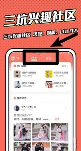 打开兴趣社区后,点击“动态”板块,就能浏览汉服、制服、Lolita等热门话题内容,还可以参与交流互动。