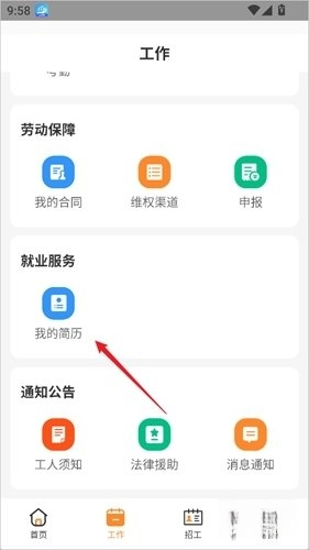 首先点击下方导航栏里的“工作”选项,接着再点击就业服务板块中的【我的简历】按钮。