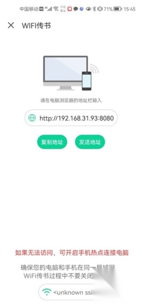 若选择WiFi传书功能,需保证您的电脑与手机处于同一局域网环境。在WiFi传书进行期间,请不要关闭当前页面。若遇到无法访问的情况,您可以开启手机热点并让电脑连接该热点来解决问题。