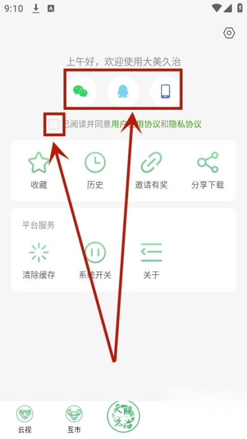 安装并打开大美久治应用,点击界面上的【同意】按钮以确认同意隐私政策。