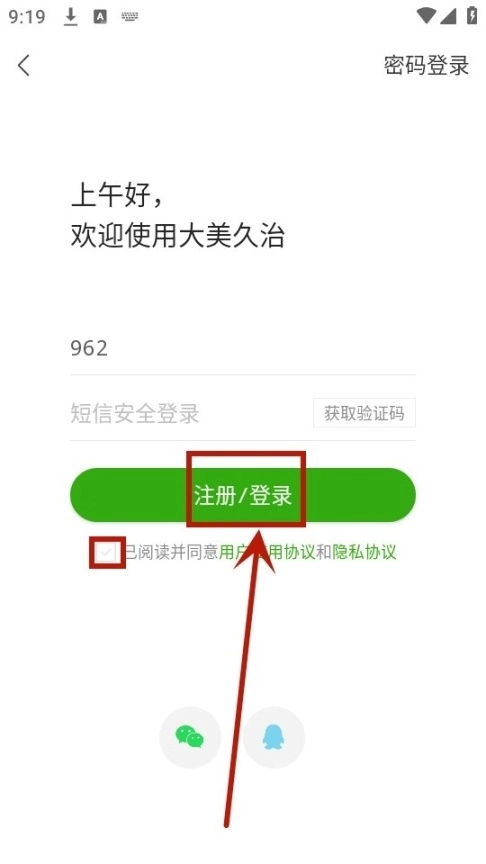 输入手机号码和短信验证码,勾选使用协议后点击【注册/登录】按钮,系统会自动完成注册与登录操作。