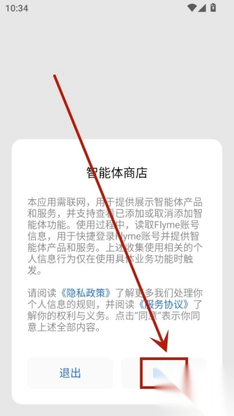先安装智能体商店并将其打开,接着点击同意按钮,以确认同意相关的隐私政策。
