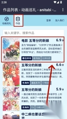 进入后,你可以在页面上方搜索相关信息进行查看,也可以点击下方的动漫作品。