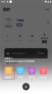 点击页面右上角的【发动态】按钮后,底部会弹出包含“发帖吧”“去签到”“赚芥末”“做任务”选项的页面。