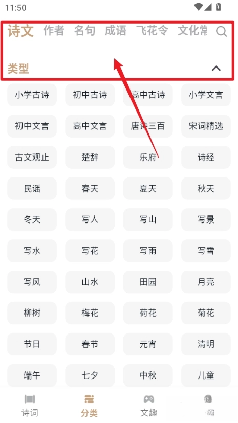 进入软件后,可以看到下方有诗词、文趣、分类等板块