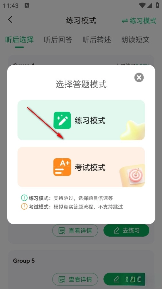 可以选择练习模式或考试模式,考试模式不支持跳过