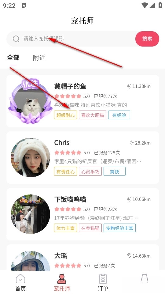 之后我们就能看到宠托师的列表,既可以通过搜索宠托师的名称来查找,也可以在页面上直接寻找并点击自己需要的宠托师。