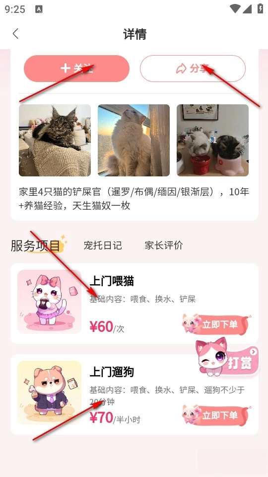 这样我们就能进入宠托师的详情页面,查看宠托师的基本信息,之后就可以下单了。