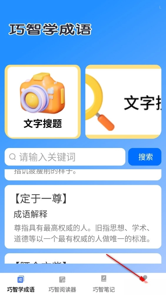 《巧智宝典》是一款实用的成语练习辅助软件,界面简洁、资源丰富,海量成语,方便随时查找学习。软件支持拍照搜索与文字输入功能,能帮助用户更快速地找到目标成语;每个成语都配有详细释义,让学习过程更加清晰易懂,有助于提升使用者的文学素养。