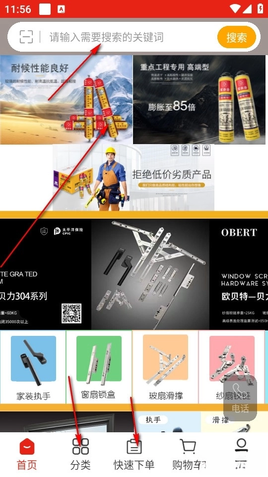 我们点击软件进入主页后,可在主页搜索或浏览是否有自己需要的商品;若没有,可点击下方的分类选项,或者直接选择快速下单功能。