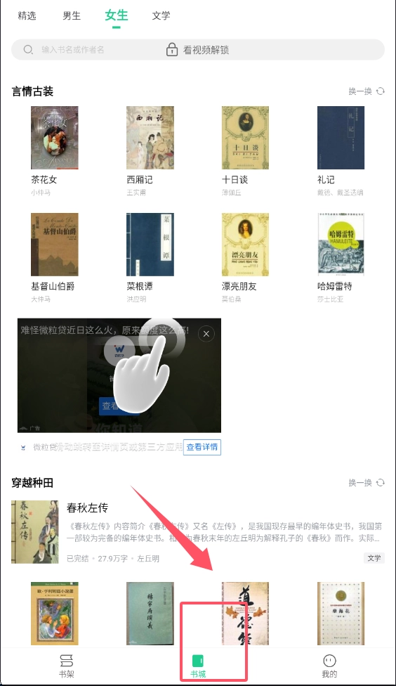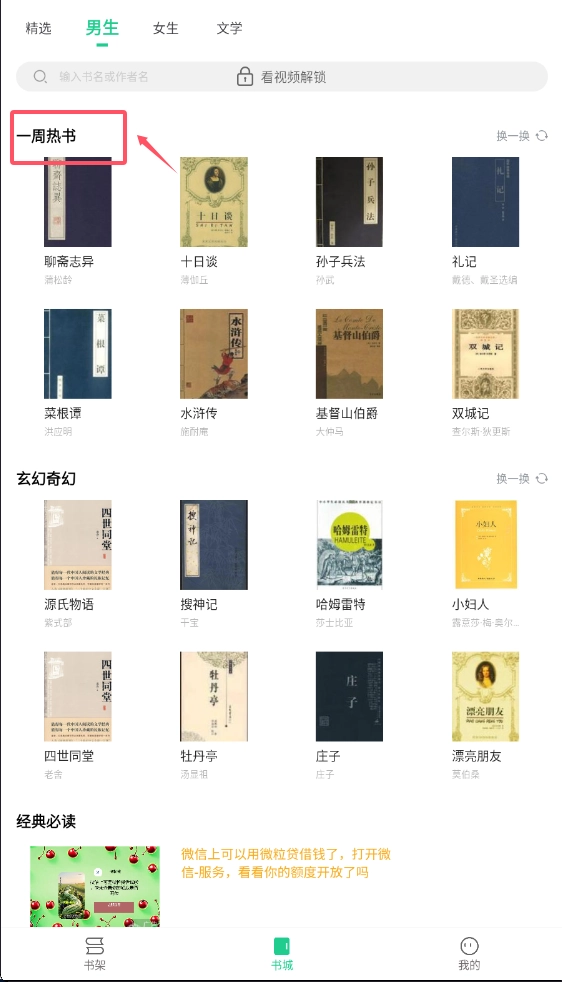 在书城的主界面上,各类书籍通过封面图的形式有序陈列着,像一周热书、玄幻奇幻这类栏目都包含其中。