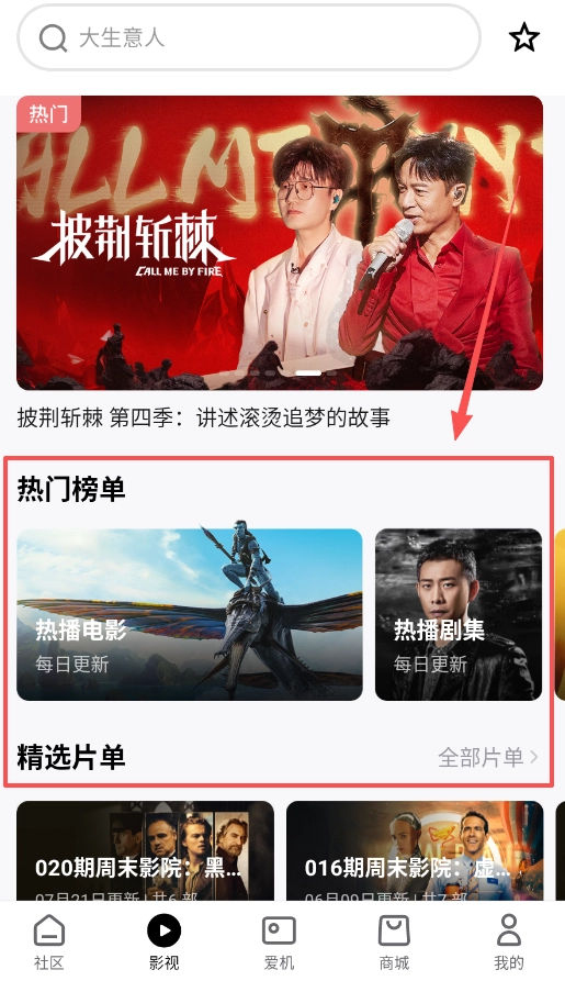 想找片看的话,直接点击“影视”板块就行。这个页面集合了当下热门内容和精心推荐的片单,像《披荆斩棘》这类热门综艺,还有周末影院这样的专题内容,都可以在这里直接找到并观看。