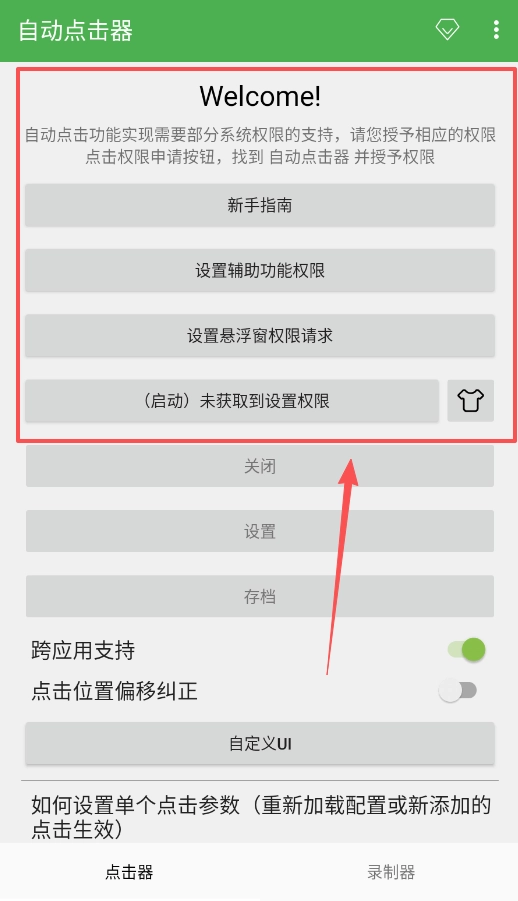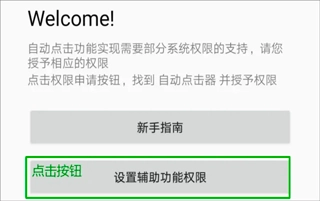 打开自动连点器应用,找到“设置辅助功能权限”的选项,然后点击进入该选项。