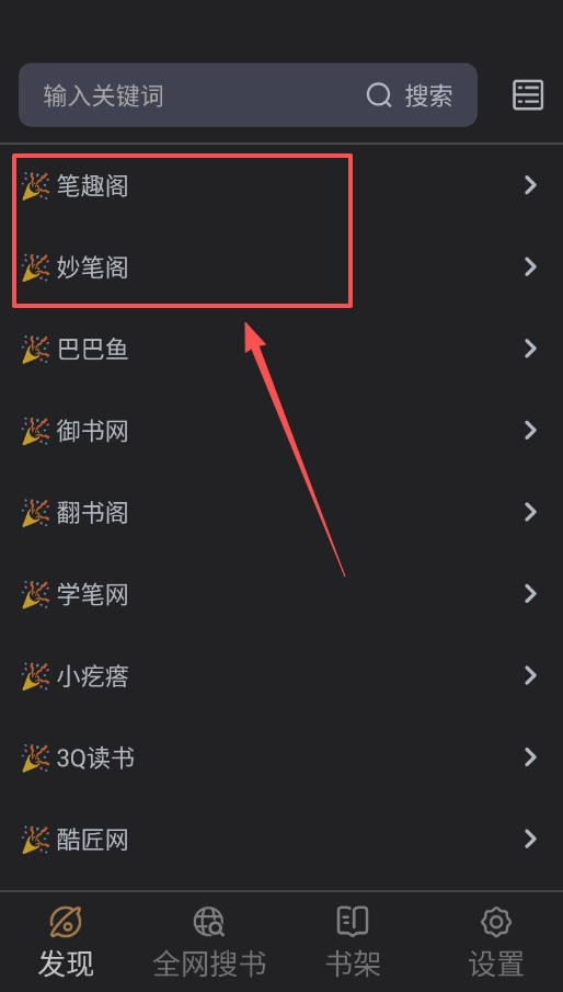 在发现页面输入书名或者作者的名字,就能从笔趣阁、妙笔阁这类书源网站搜索书籍,找到合适的书籍后添加到书架里就可以开始阅读了。