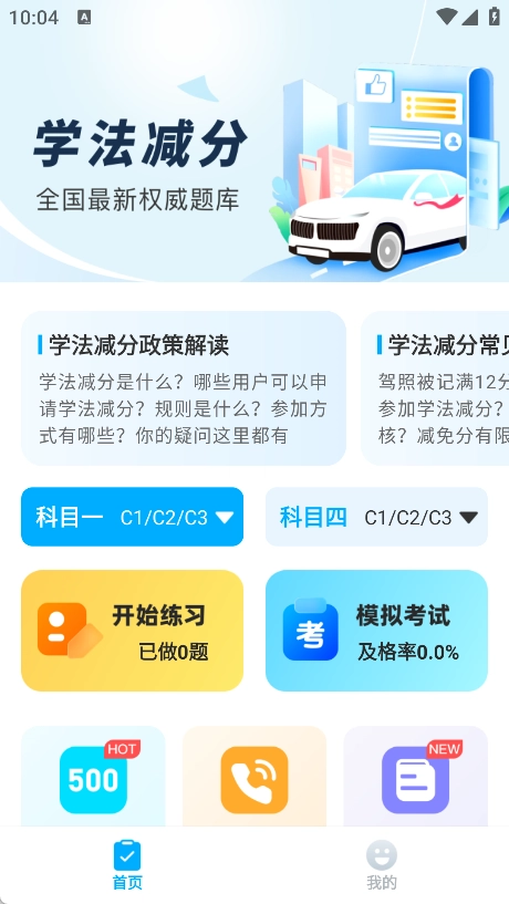 首页上不仅有学法减分的相关政策和常见问题解答,还提供了科目一、科目四的练习题以及模拟考试等内容。