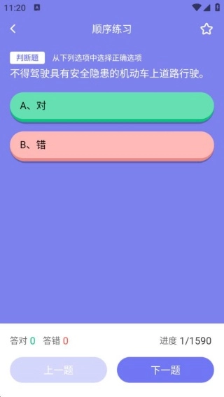 进入题目练习界面后,主要进行的是判断题学习,还能随时查看答题进度。