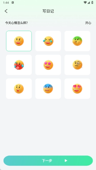 在写日记的页面里挑选心情,接着点击下一步,输入相关信息后完成保存。