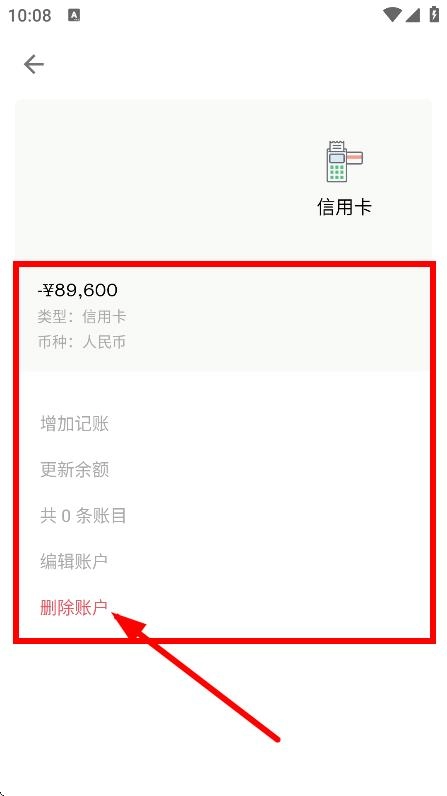 在信用卡详情页面,点击“删除账户”按钮,即可删除对应的信用卡账户。