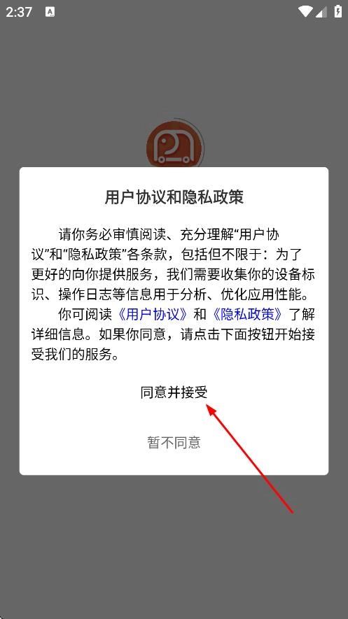在用户协议与隐私政策的弹窗界面,点击同意并接受相关条款后,即可进入应用的首页。