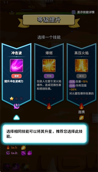 4、每提升一级可从多种技能中选择其一,合理搭配可快速清理单体与小范围敌人,加快升级节奏。