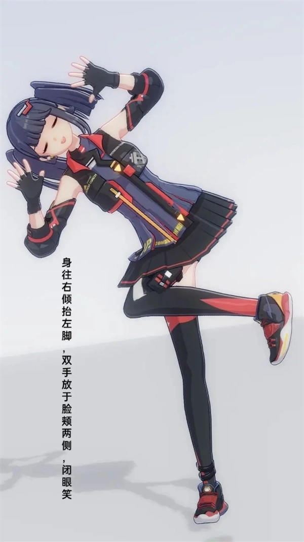 2、身体往右倾抬左脚,双手放于脸颊两侧,闭眼笑