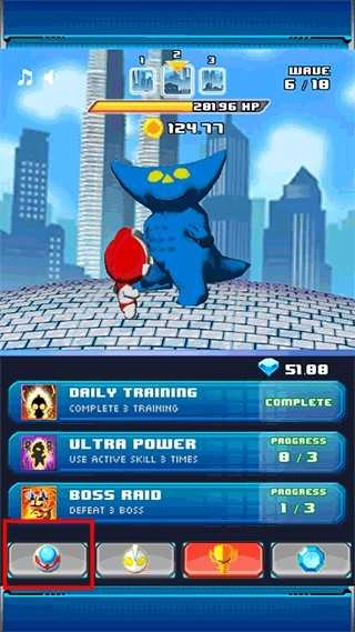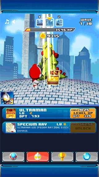左下角圆形图标为技能激活区,点击后奥特曼将触发形态跃迁,释放更强力量应对危机。