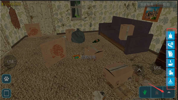 成功进入房间,点击右下角的这个图标可以使用道具来打扫垃圾;