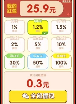 这款游戏确实可以,它采用闯关模式,只需通过简单的消除操作就能轻松通关并领取红包奖励。当积累的红包达到一定门槛后,就可以按比例兑换到微信,而且闯过的关卡越多,兑换比例还会越高呢!