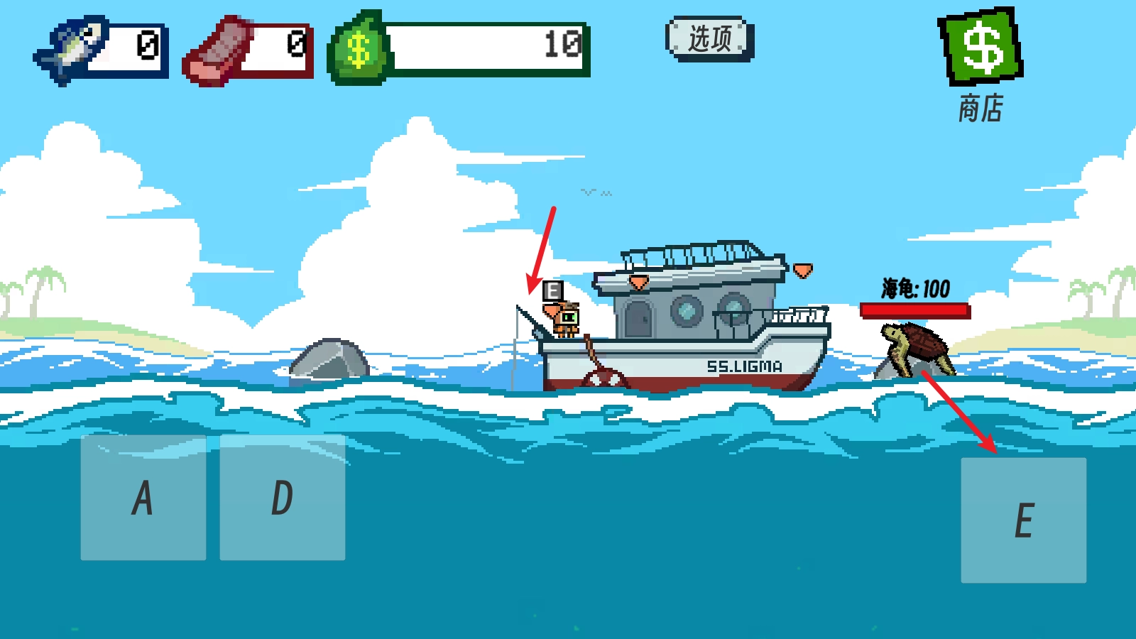 我们可以用A键和D键来操控鱼钩进行钓鱼,而且鱼钩下得越深,钓到的鱼品质就越高。