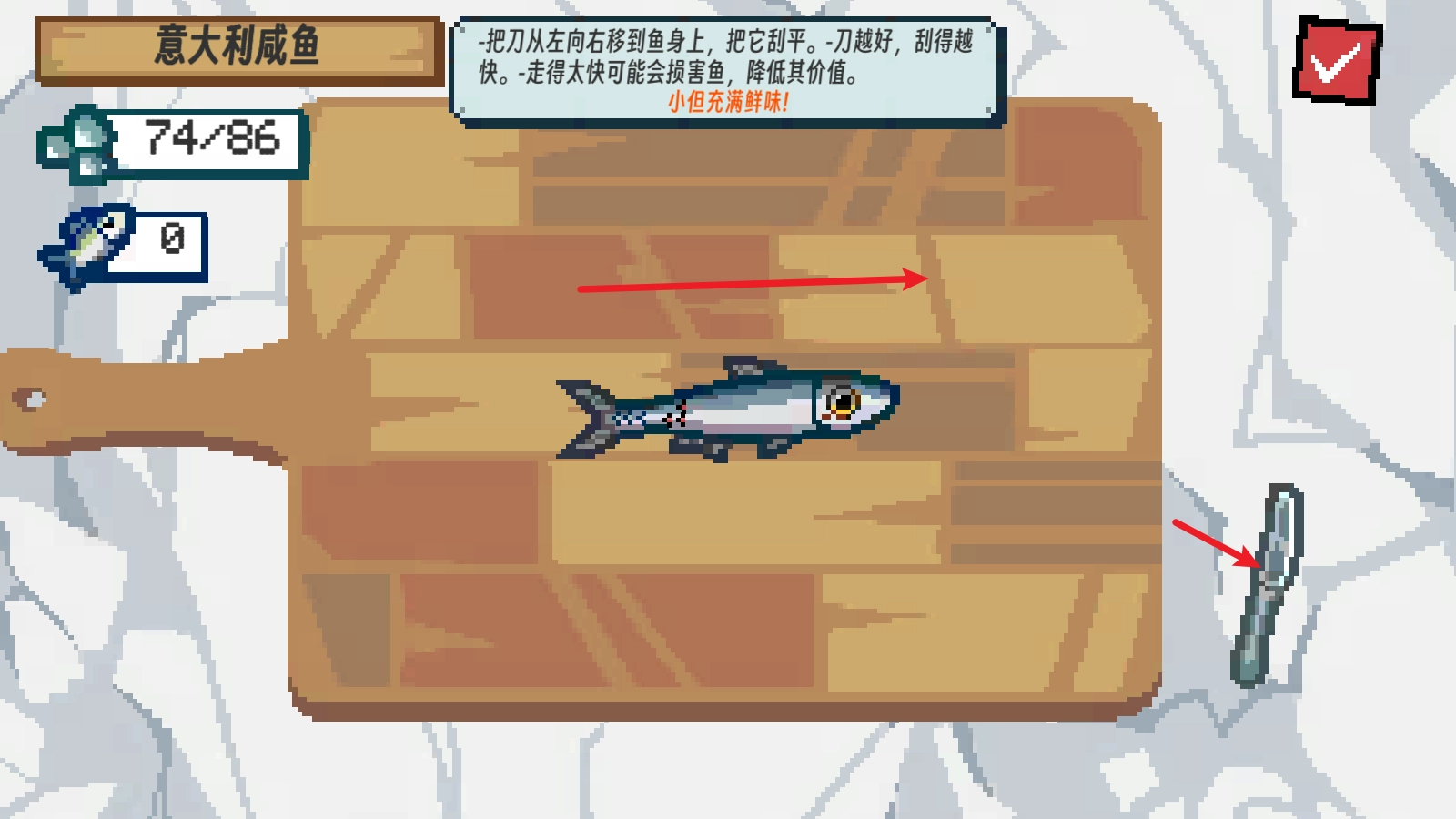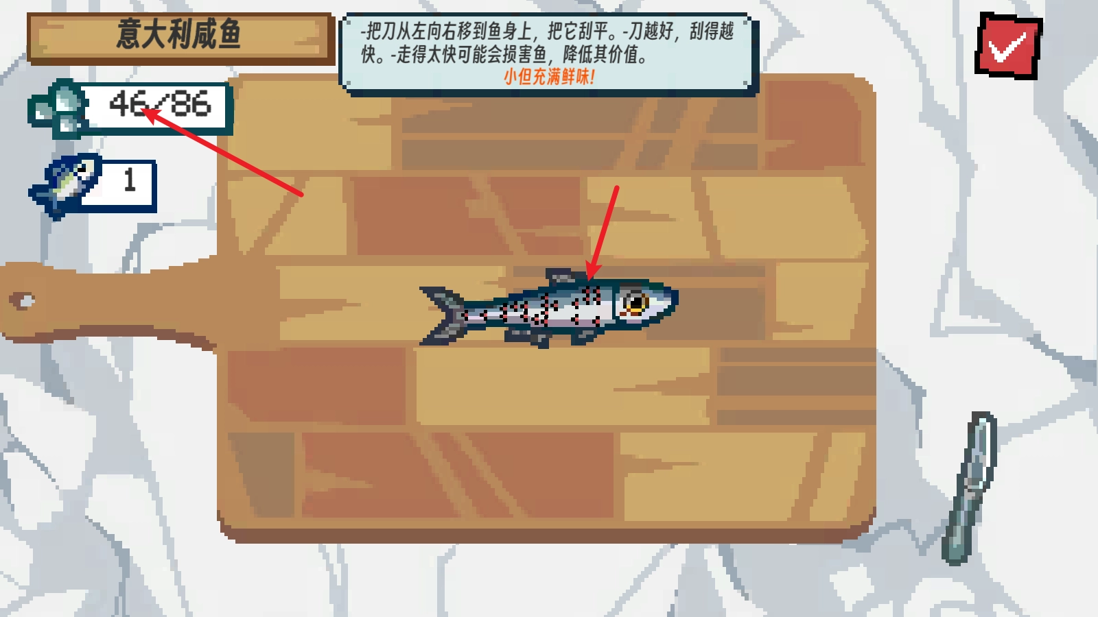 刮鳞可不是简单活儿,得耐心细致地慢慢处理,这样才能把小鱼收拾得干干净净,拿到更丰厚的奖励呢!