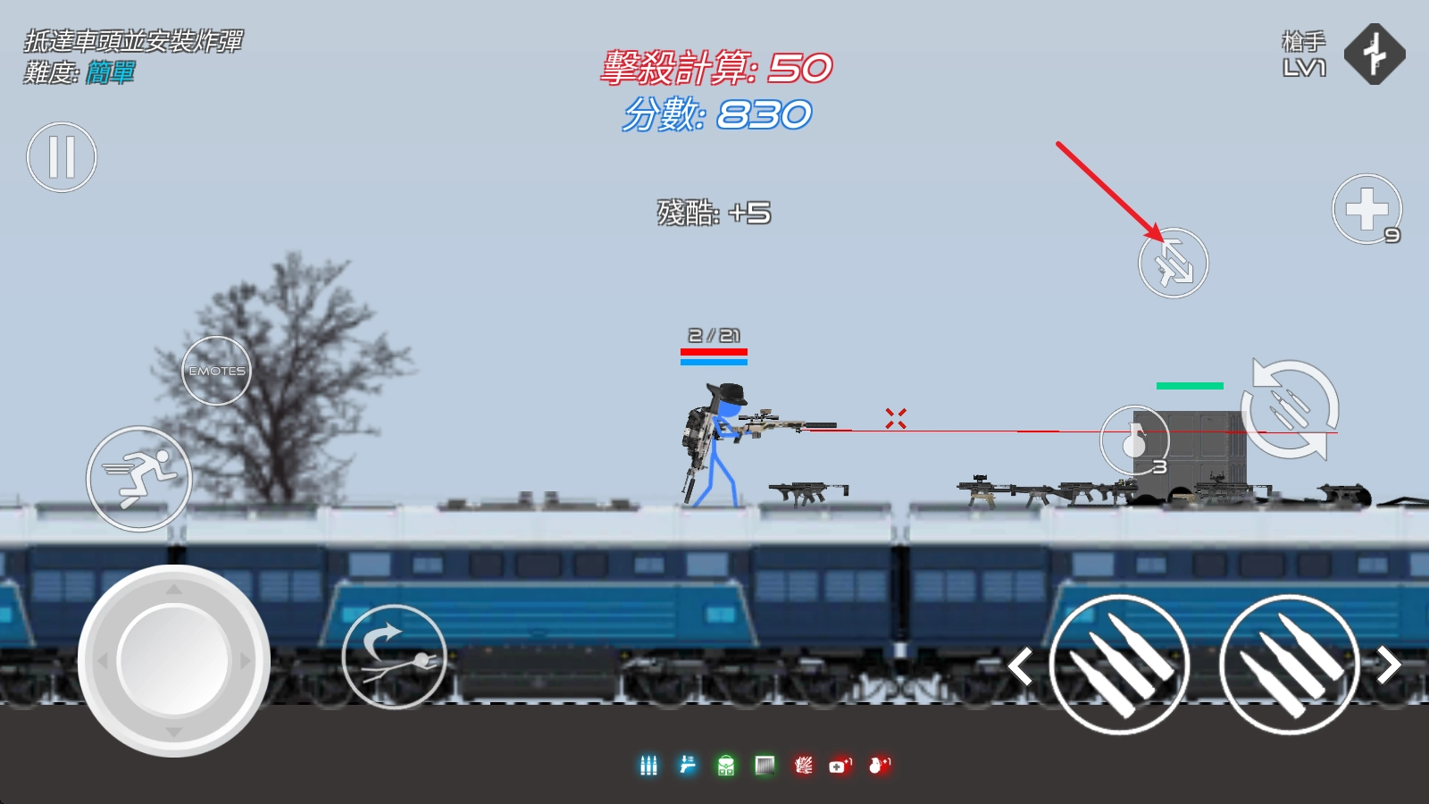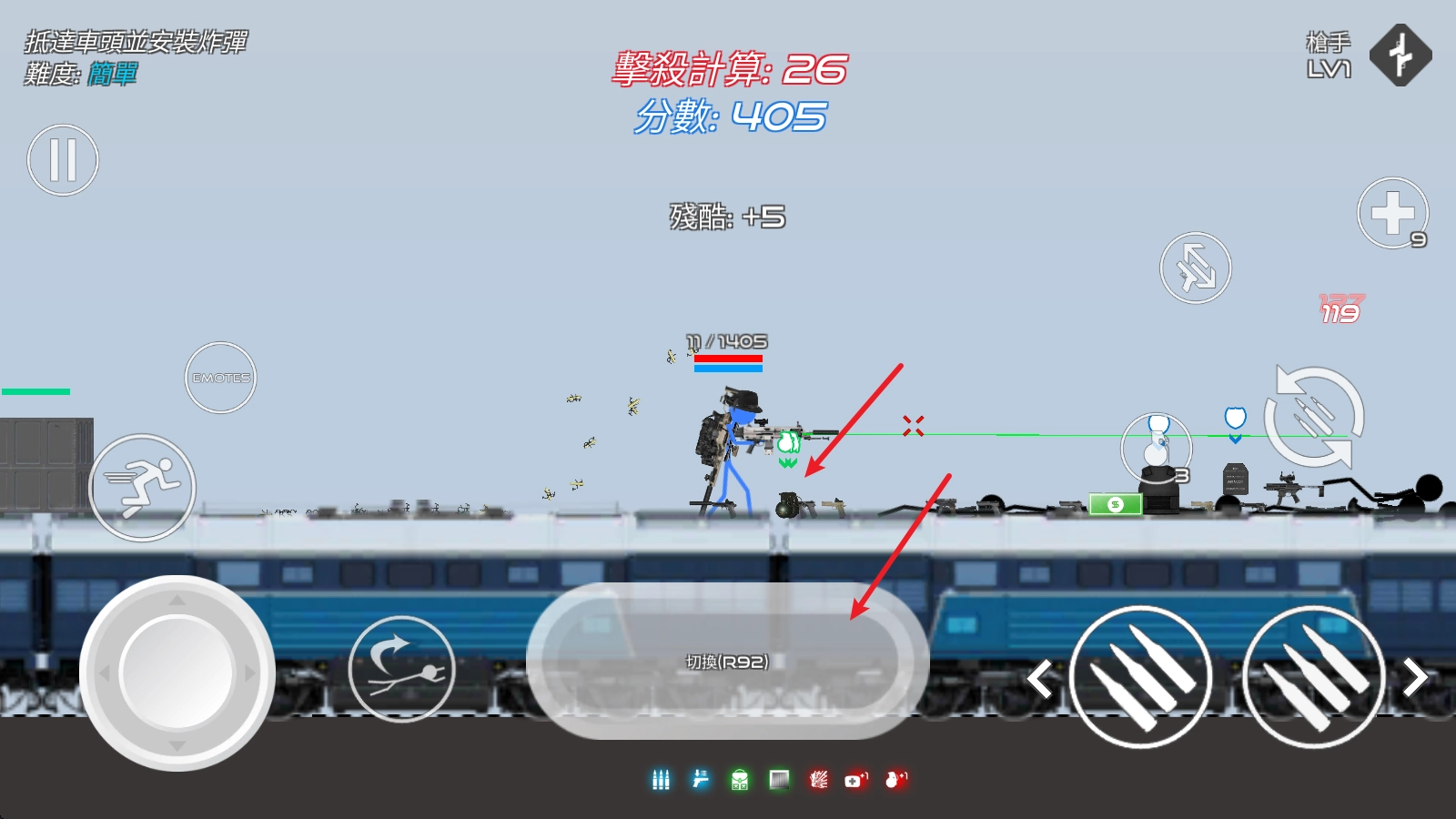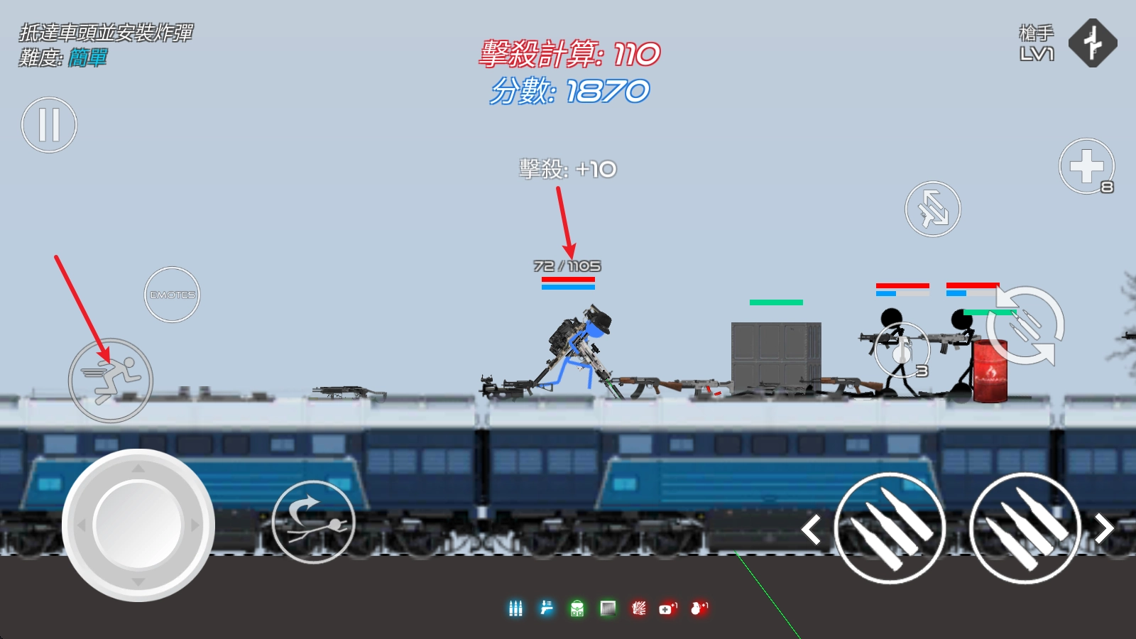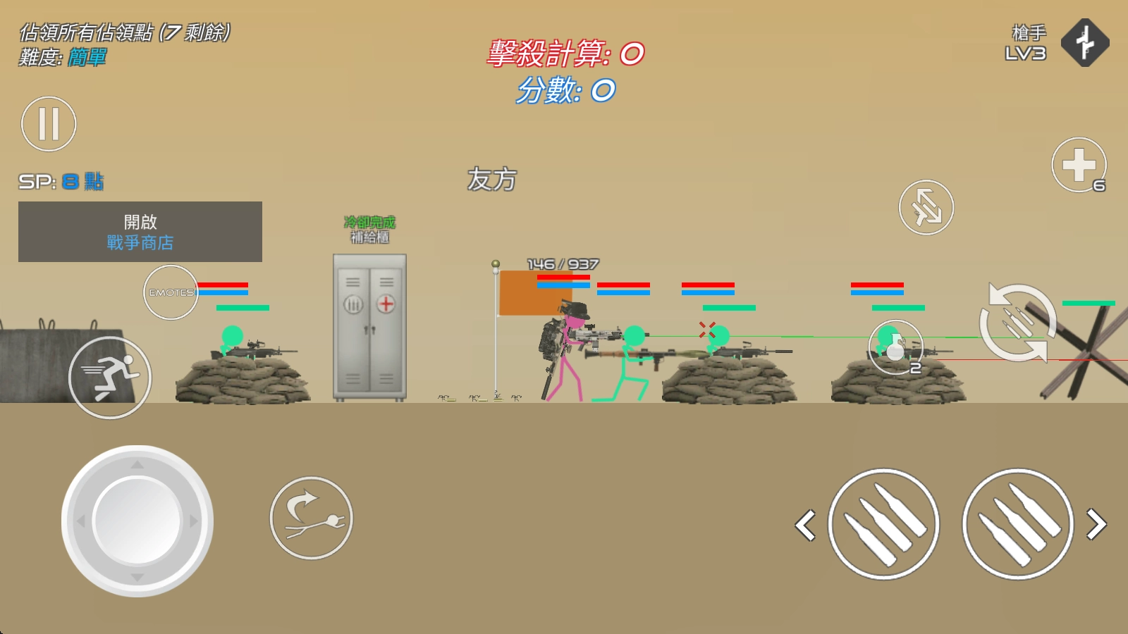 进入战场后,左边的摇杆用来操控角色移动,右边的子弹按钮负责射击功能。