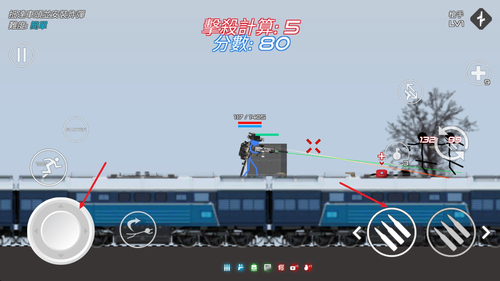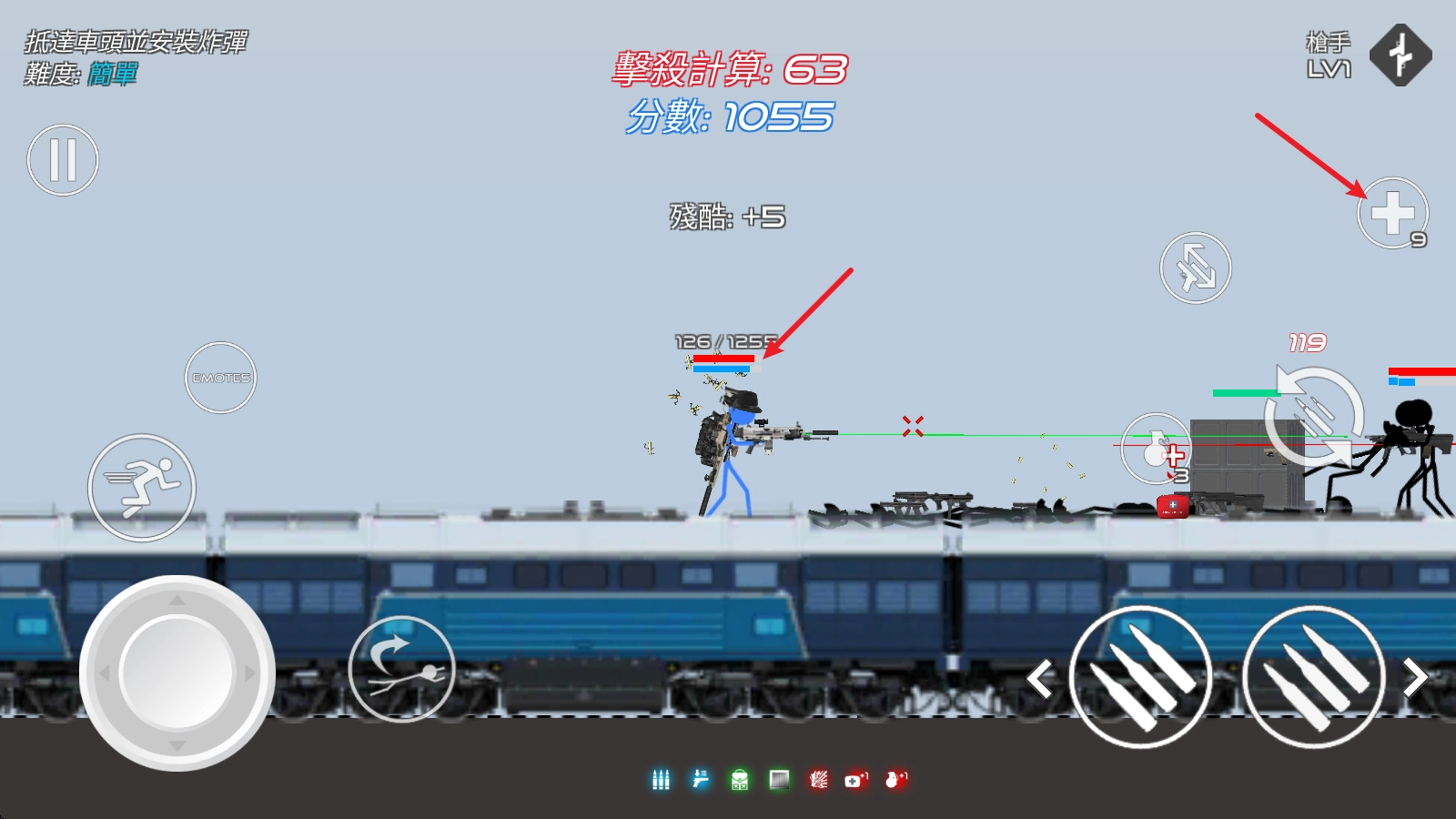 人物头顶显示的是血条,当血量减少后,点击右侧的医疗包即可恢复生命值。