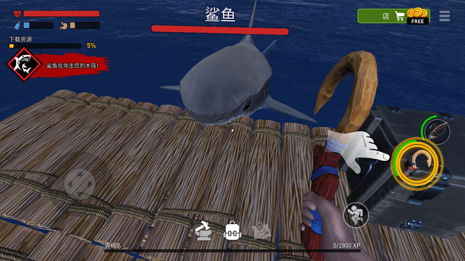 时刻留意海底潜藏的危机,木筏周边隐匿着不少随时可能将你吞噬的危险生物,务必保持警觉!