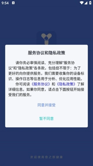 安装软件并进入后,会弹出服务协议与隐私政策,点击同意即可。