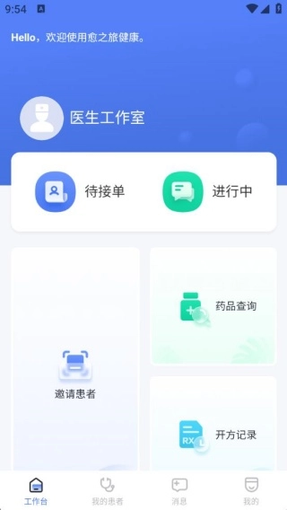 愈之旅健康是一款面向医生群体开发的问诊办公类手机应用,能够为医生提供涵盖患者问诊接单、病情沟通、在线开具处方、药品信息查询以及患者管理的全流程服务,可适配医生线上诊疗办公的各类场景,还支持医生工作室的搭建,并配备了电子签名、电子签章采集等符合规范要求的功能。