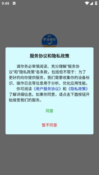 1、软件安装完成后打开进入,会弹出服务协议与隐私政策的提示,点击“同意”即可。