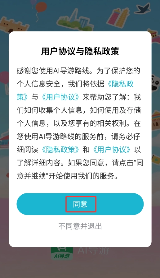 首次启动AI导游路线功能时,系统会弹出用户协议确认窗口,需点击“同意”按钮才能进入应用主界面。