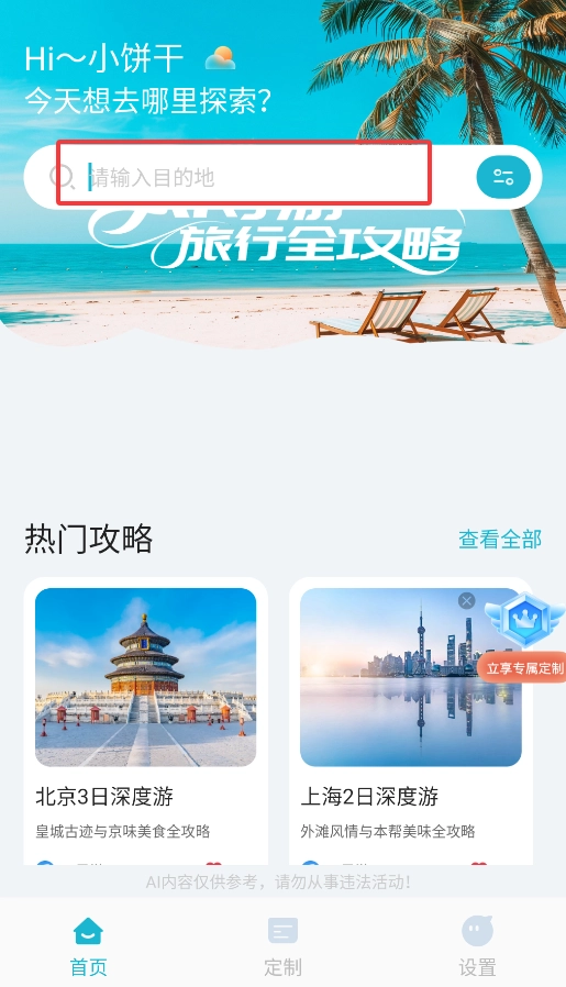 2、在首页的搜索栏中输入你想要查找的景点或目的地名称,就能看到与之相关的旅游路线推荐了。