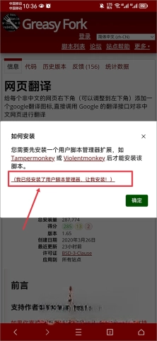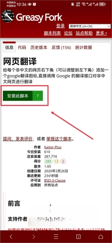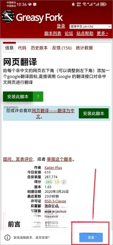 1、以网页翻译类脚本为例,打开该脚本的详情页面后,直接点击“安装此脚本”按钮即可。