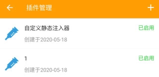 6、修改完成后,点击右上角的√进行保存。保存成功后,进入设置里的插件管理界面,就能找到刚才创建的静态注入插件,点击启用按钮就可以了。