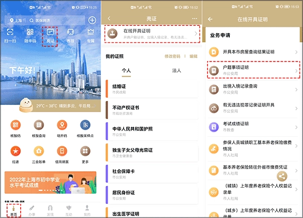1、通过实名认证登录“随申办市民云”平台→在首页找到并点击“亮证”功能→进入后选择“在线开具证明”选项→点击“户籍事项证明”即可进入对应的申请界面。