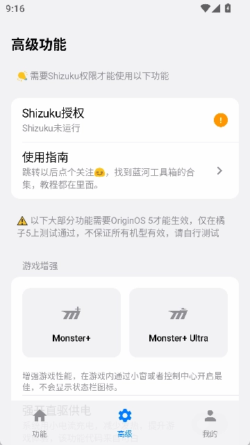 2.进入【高级】板块,该页面具备更多功能,但使用这些功能需要通过shizuku授权。