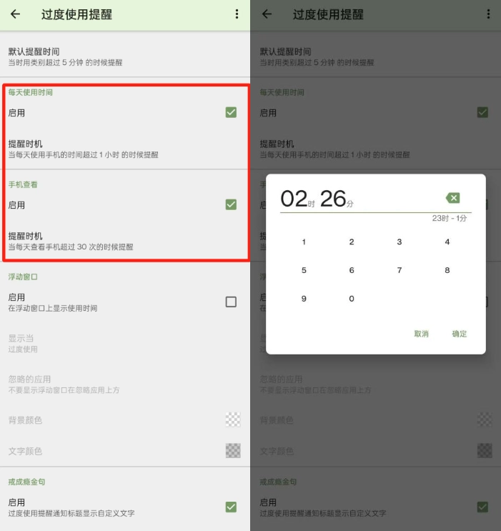 可以依据使用时长设置提醒,也能够按照手机的打开次数来设定提醒。